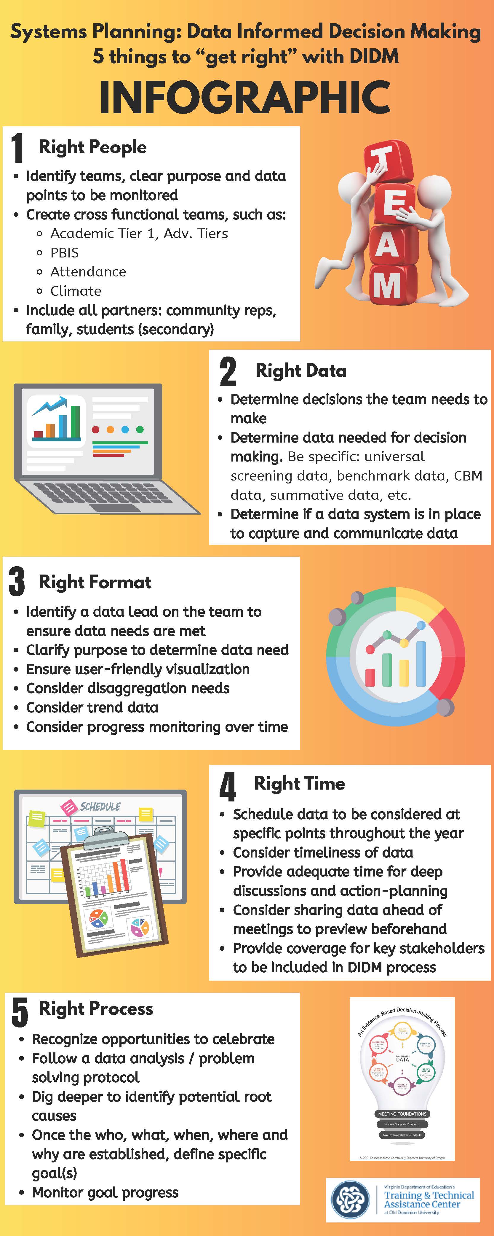 Making impactful data-informed decisions requires more than data alone—it requires intentional systems and structures that support meaningful use. The infographic linked below, highlights key elements to consider within each of the 5 critical factors to have “right” when preparing to make data informed decisions: getting the “right people” the “right data” in the “right format” within the “right time” using the “right process” in order to make well informed decisions for divisions, departments, schools, staff, classrooms, students and families. To read a more in-depth description of each area, click on each link to be taken directly to the related article.